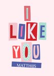 Schuilt er een romanticus in jou? Stuur deze leuke Vallentijnkaart dan en tover een glimlach op iemands gezicht! Op de kaart staat: I like you [naam].