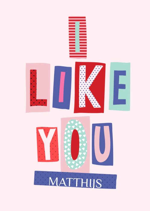 Schuilt er een romanticus in jou? Stuur deze leuke Vallentijnkaart dan en tover een glimlach op iemands gezicht! Op de kaart staat: I like you [naam].
