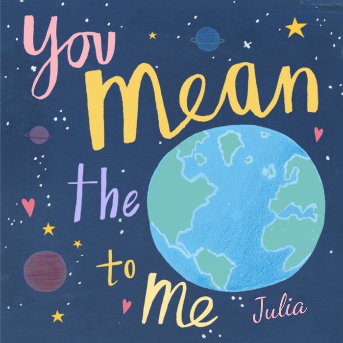 Wie ga jij verrassen met Valentijn? Stuur deze leuke Valentijnskaart om te verrassen. Op de kaart staat: You mean the world to me.