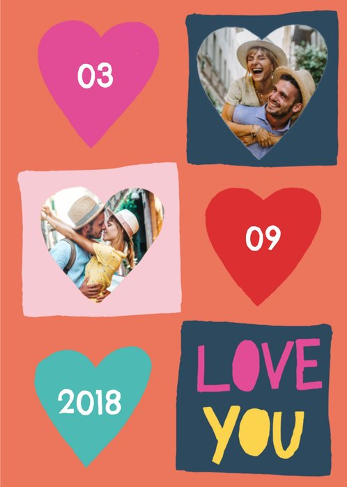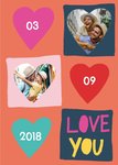 Kleurrijke valentijnskaart met harten, aanpasbare fotos en de tekst: 'Love you'. Verras iemand met deze mooie valentijnskaart van Greetz.