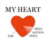 Lieve valentijnskaart met een hart op de kaart die verdeeld is in pizza, kittens, space en het grootste deel van het hart is gevuld met you.