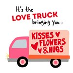 Leuke valentijnskaart met een vrachtwagentje en de tekst: It's the love truck bringing you... kisses flowers & hugs