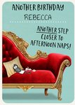 Wat leuk, jij kent iemand die binnenkort weer kaarsjes mag uitblazen. Verras met deze leuke verjaardagskaart van Greetz! Op de kaart staat: Another birthday [naam]. Another step closer to afternoon naps!