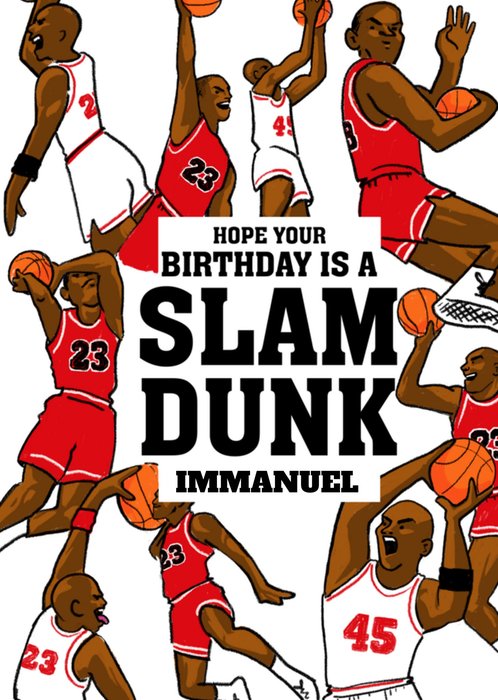 Hoera! Iemand is jarig. Stuur daarom deze verjaardagskaart van Greetz! Op deze verjaardagskaart staat: Hope your birthday slam dunk [naam].
