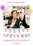 Jij kent iemand die binnenkort jarig is. Feliciteer met een leuke verjaardagskaart van Greetz! Op deze kaart staat: To a totally fab best friend. Sparkle on your birthday [naam].