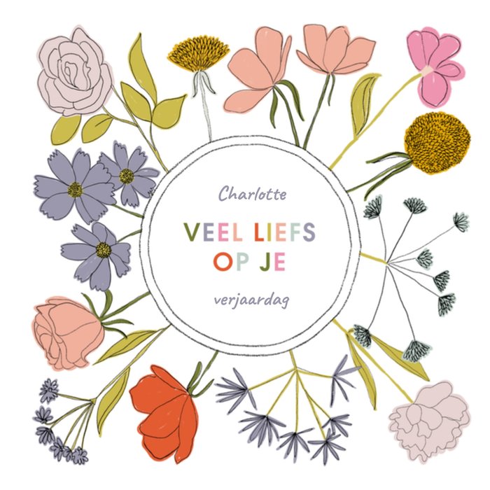 Feest is het! Want jij kent iemand die binnenkort de vlaggen uithangt! Stuur deze leuke verjaardagskaart van Greetz als verrassing. Op de kaart staan bloemen en de tekst: [naam] Veel liefs op je verjaardag.