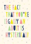 Wens een fijne verjaardag met deze leuke verjaardagskaart van Greetz. Op de kaart staat: The fact that you're legally an adult is hysterical!