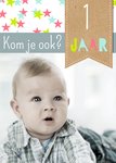 Trendy uitnodiging met sterren. Op de voorkant kan een eigen leeftijd en foto worden toegevoegd.