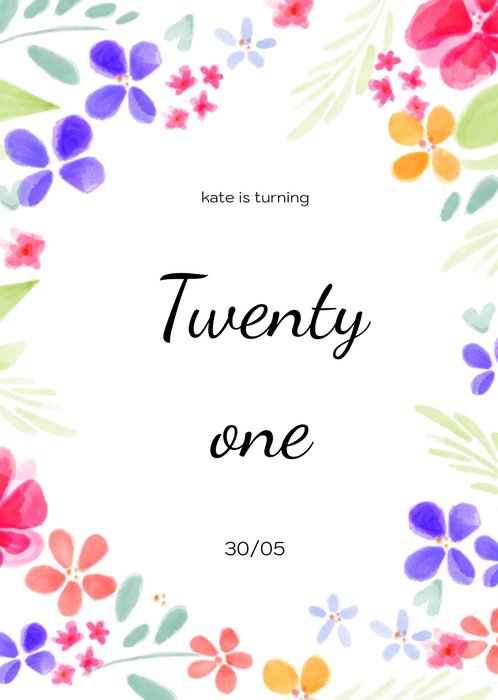 Nodig iedereen uit voor jouw verjaardagsfeest met deze mooie uitnodiging met bloemen in verschillende kleuren. De tekst op de kaart is aanpasbaar.