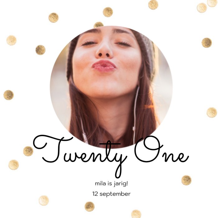 Nodig iedereen uit voor jouw verjaardagsfeest met deze uitnodiging waarop jouw foto centraal staat. De tekst op de kaart is aanpasbaar. Verder staan er een aantal gouden munten op de kaart.