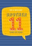 Blauwe verjaardagskaart met tekstballon: For a brilliant brother 11 years old today!