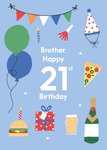Leuke verjaardagskaart voor een 21 jarige broer. Met champagne, bier en pizza.