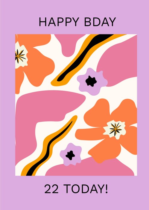Wenskaart van Greetz ontworpen door Greetz designers, volgens de laatste trends. Voeg je eigen foto('s), tekst, & versiering toe om de kaart extra persoonlijk te maken. Je kunt de kaart toevoegen aan je favorieten of tussentijds opslaan om deze later af te maken. Prachtige verjaardagskaart met een kleurrijke achtergrond, bloemen en de aanpasbare tekst: 'Happy bday 22 today!'. Verras de jarige met deze lieve verjaardagskaart van Greetz.