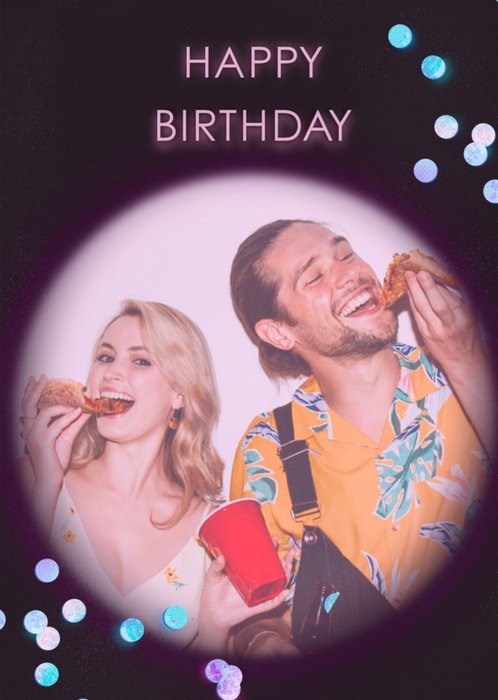 3D verjaardagskaart met aanpasbare foto, confetti en de tekst: 'Happy Birthday'. Verras iemand met deze typografische verjaardagskaart van Greetz.
