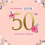 Stijlvolle verjaardagskaart met daarop een bloemen patroon. Op de kaart staat: For a wonderful sister 50 th birthday wishes.