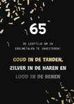 Grappige verjaardagskaart met de tekst: 65 de leeftijd om in edelmetalen te investeren! Goud in de tanden, zilver in de haren en lood in de benen. Wenskaart van Greetz ontworpen door Greetz designers, volgens de laatste trends. Voeg je eigen foto('s), tekst, & versiering toe om de kaart extra persoonlijk te maken. Je kunt de kaart toevoegen aan je favorieten of tussentijds opslaan om deze later af te maken. Meer verjaardagskaarten zien? Check ze hier.