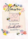 Fleurige verjaardagskaart met aanpasbare leeftijd en de tekst: Mam 50 vandaag ik wens je de leukste verjaardag x