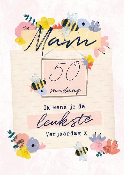 Fleurige verjaardagskaart met aanpasbare leeftijd en de tekst: Mam 50 vandaag ik wens je de leukste verjaardag x