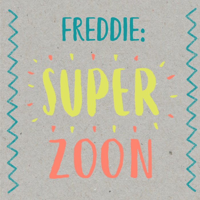 Leuke grijze verjaardagskaart met aanpasbare naam en de tekst: Freddie super zoon.