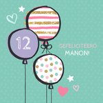 Vrolijke verjaardagskaart met ballonnen en aanpasbare naam en leeftijd.