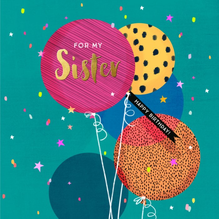Kleurrijke verjaardagskaart met meerdere ballonnen op de kaart. 'For my sister happy birthday' staat er geschreven op de kaart.
