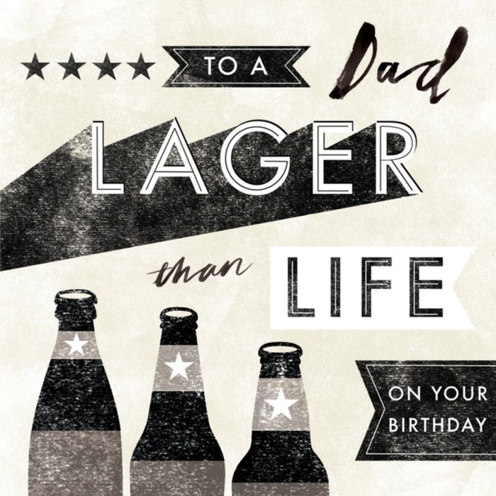 Stoere verjaardagskaart met biertjes en de tekst: To a dad lager than life on your birthday.