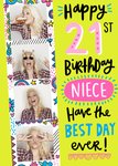 Kleurrijke verjaarsdagkaart met de mogelijkheid om meerdere foto's toe te voegen. Op de kaart staat: Happy 21st birthday niece have the best day ever!