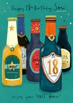 Stoere verjaardagskaart met verschillende biertjes en de tekst: Happy 18th birthday son enjoy your first beer!