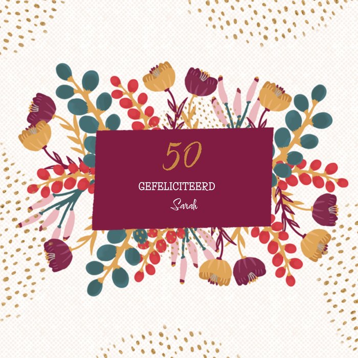 Wens een Sarah een fijne 50ste verjaardag toe met deze verjaardagskaart met bloemen op de kaart en de tekst: 50 gefeliciteerd Sarah.