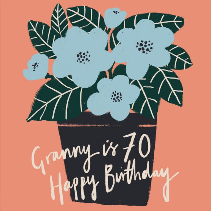 Mooie verjaardagskaart een leuke plant en de tekst: Granny is 70 happy birthday.