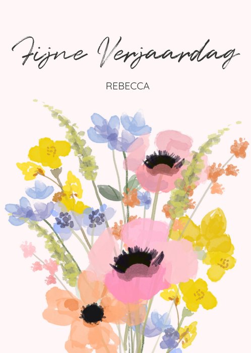 Wat leuk! Er is iemand jarig. Verras met deze leuke verjaardagkaart van Greetz! Op de kaart staan bloemen en de tekst: Fijne verjaardag. Ook kun je een naam toevoegen.