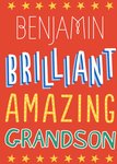 Vrolijke verjaardagskaart voor een kleinzoon met de tekst: Benjamin Brilliant, amazing grandson. De naam is aanpasbaar.