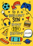 Vrolijke verjaardagskaart met illustraties van een voetbal, burger, hotdog en nog veel meer. Op de kaart staat: To a brilliant son. Happy 11th birthday Dylan. De naam is aanpasbaar.