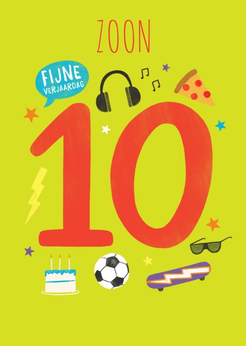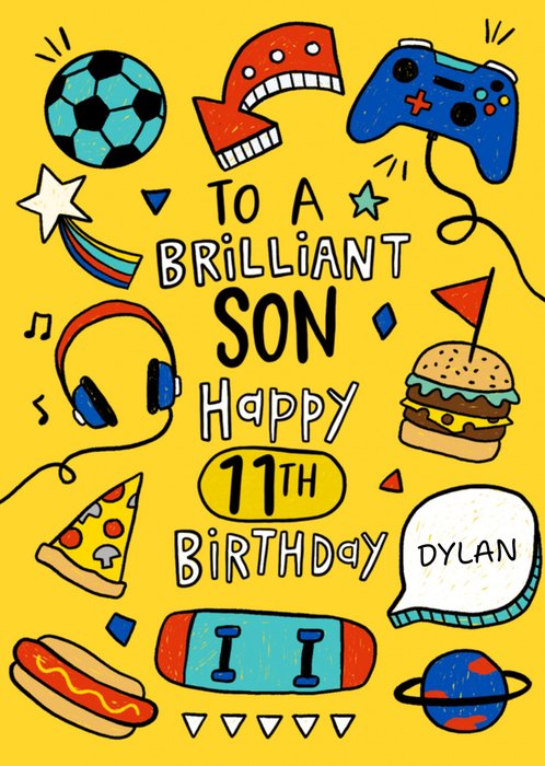 Vrolijke verjaardagskaart met illustraties van een voetbal, burger, hotdog en nog veel meer. Op de kaart staat: To a brilliant son. Happy 11th birthday Dylan. De naam is aanpasbaar.