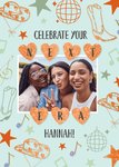Personaliseerbare fotokaart met glinsterende oranje hartjes die “NEXT ERA” spellen, speelse country-disco iconen en ruimte voor je favoriete foto – ideaal om een nieuw begin te vieren.