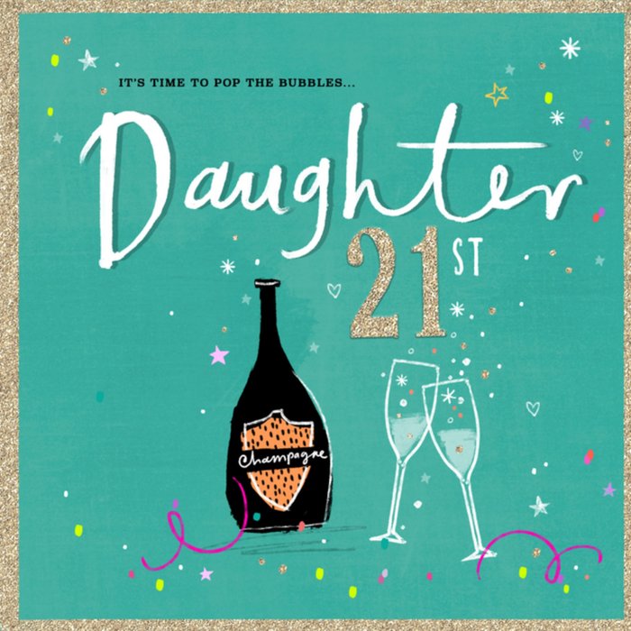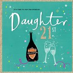 Vrolijke verjaardagskaart met een illustratie van een fles champagne. Op de kaart staat: It's time to pop the bubbles. Daughter 21st