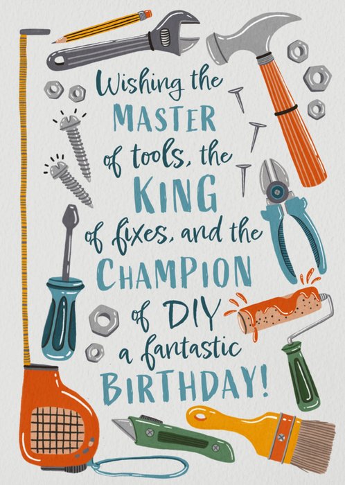 Mooie verjaardagskaart met illustraties van gereedschap en de tekst: 'Wishing the master of tools, the king of fixes, and the champion of DIY a fantastic birthday!'. Verras iemand met deze kleurrijke verjaardagskaart.