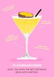 Verjaardagskaart met een cocktail en aanpasbare naam. Op de kaart staat: To a fabulous friend. Alice, you know the best birthdays begin with martinis!