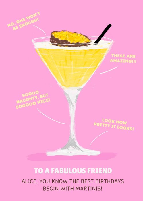 Verjaardagskaart met een cocktail en aanpasbare naam. Op de kaart staat: To a fabulous friend. Alice, you know the best birthdays begin with martinis!