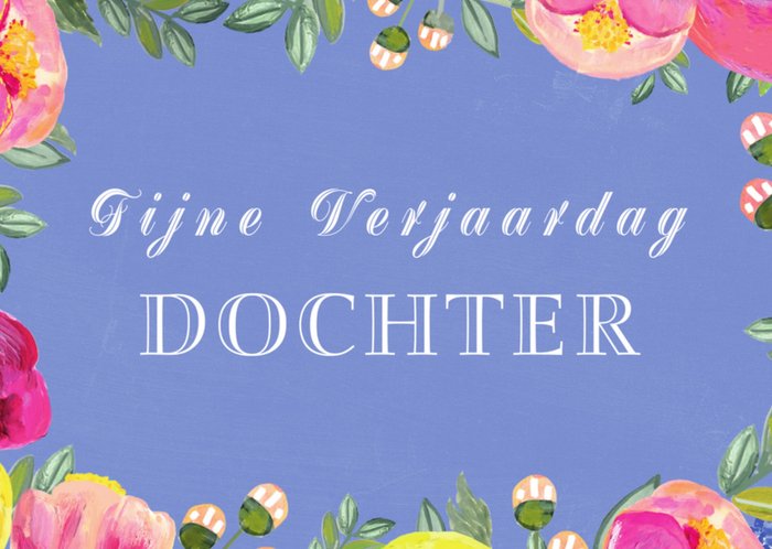 Mooie verjaardagskaart met bloemen en de tekst: Fijne verjaardag dochter. Wenskaart van Greetz ontworpen door Greetz designers, volgens de laatste trends. Voeg je eigen foto('s), tekst, & versiering toe om de kaart extra persoonlijk te maken. Je kunt de kaart toevoegen aan je favorieten of tussentijds opslaan om deze later af te maken. Meer verjaardagskaarten zien? Check ze hier.