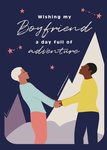 Mooie verjaardagskaart met twee dansende mensen. Op de kaart staat: Wishing my boyfriend a day full of adventure.