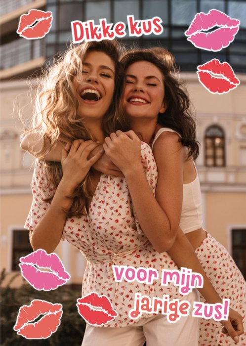 Lieve verjaardagskaart met aanpasbare foto en de tekst: 'Dikke kus voor mijn jarige zus'. Verras je zus met deze leuke verjaardagskaart van Greetz.