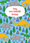 Schattige verjaardagskaart met dino's en aanpasbare naam. Op de kaart staat: Have a roarsome birthday!