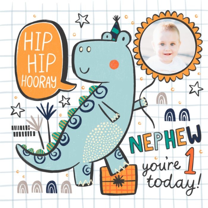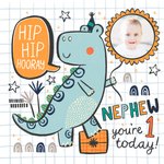 Vrolijke verjaardagskaart met een grote dinosaurus op de kaart. Je hebt de mogelijkheid om een eigen foto toe te voegen. Op de kaart staat: Hip hip hooray. Nephew you're 1 today!