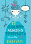 Lieve verjaardagskaart met een meisje, op haar jurk staat: To an amazing daughter on your birthday. De naam op de kaart is aanpasbaar.