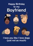 Grappige verjaardagskaart met de tekst: Happy birthday to my boyfriend I love you like I love dogs (just not as much)