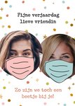 Wens je vriendin een fijne verjaardag toe met deze grappige verjaardagskaart. Voeg twee leuke foto's toe en op de kaart staat de tekst: Fijne verjaardag lieve vriendin. Zo zijn we toch een beetje bij je!