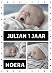 Collage fotokaart. De tekst op de voorkant is naar wens aan te passen. Voeg je eigen foto's, tekst & versiering toe om de kaart extra persoonlijk te maken. Je kunt de kaart toevoegen aan je favorieten of tussentijds opslaan om deze later af te maken. Collage kaart met 3 eigen foto's en aanpasbare tekst