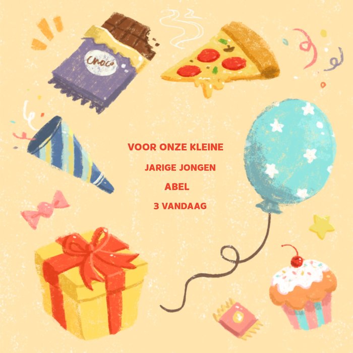 Smakelijke verjaardagskaart met allemaal lekkernijen en de tekst: Voor onze kleine jarige jongen Abel 3 vandaag. De naam is aanpasbaar.