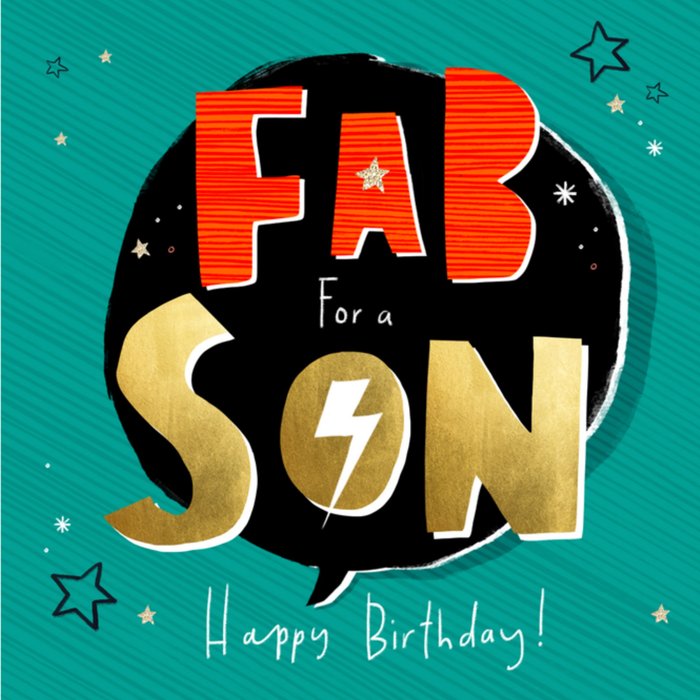 Coole verjaardagskaart met sterren en een tekstwolkje met daarop de tekst: Fab for a son. Happy birthday.